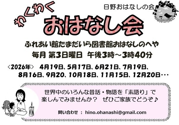 日本や世界の昔話、物語を語るストーリーテリングのおはなし会です。多年齢にむけたプ…
