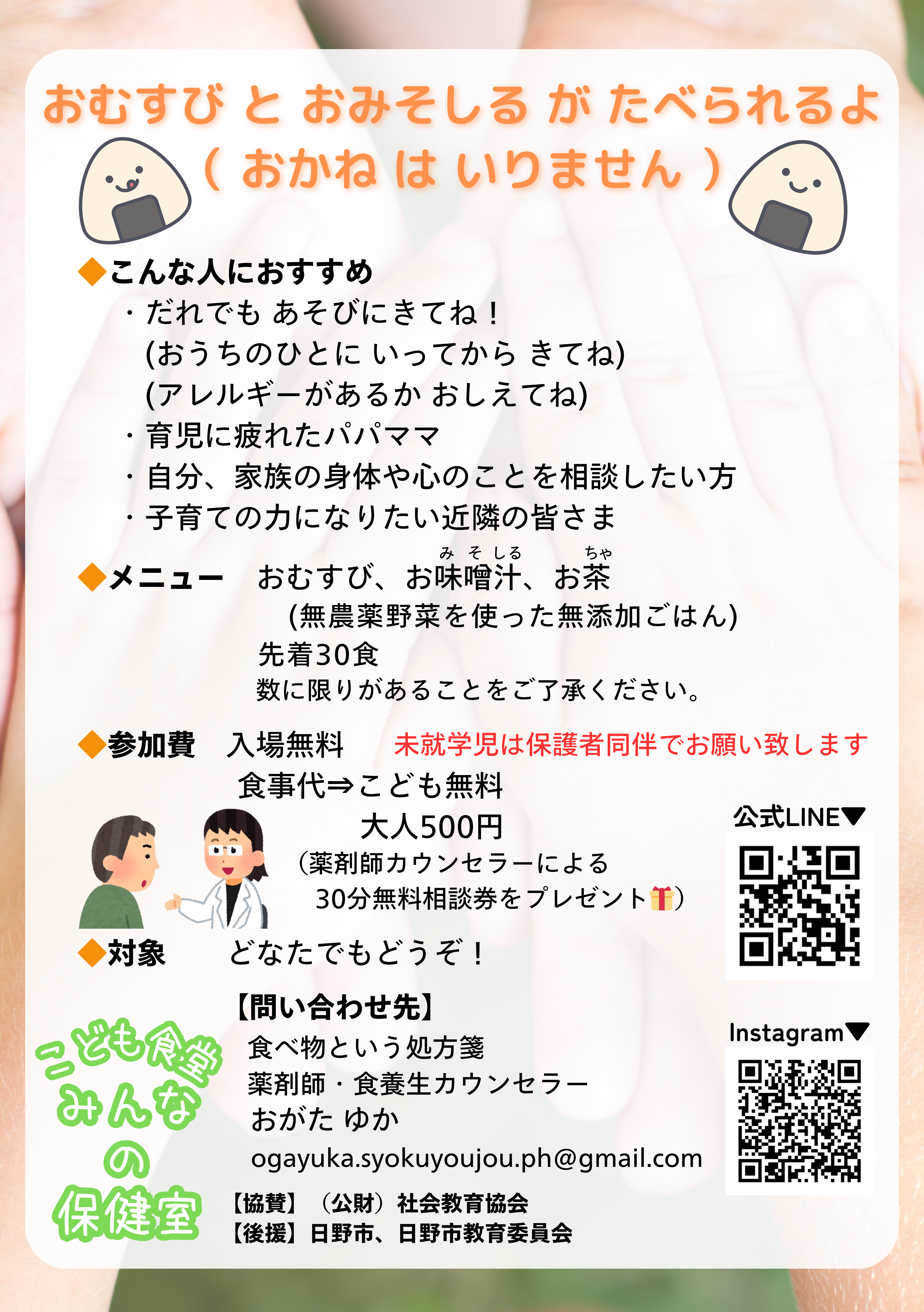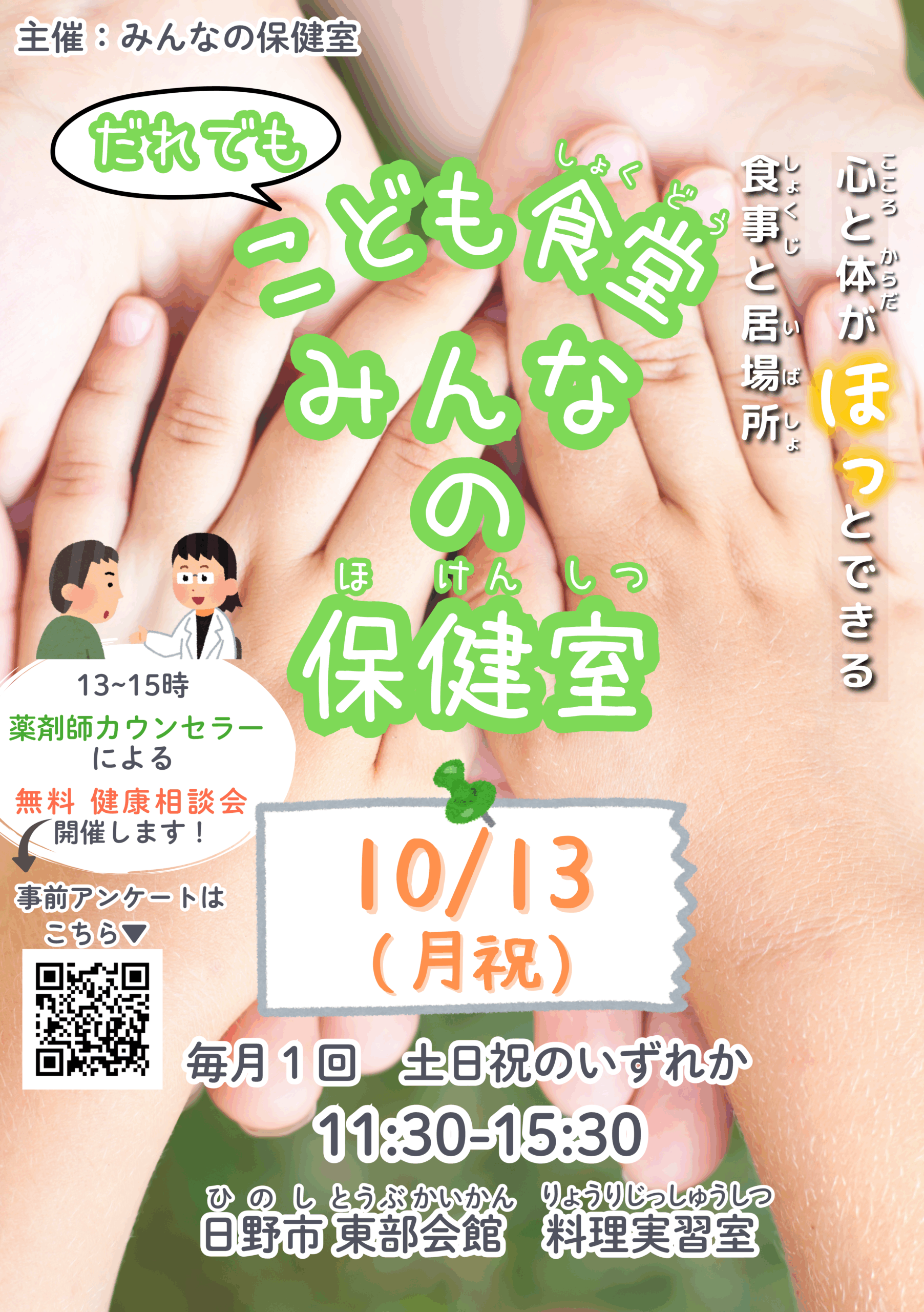 参加費 入場無料 食事代は子ども無料、大人500円 健康相談会は無料