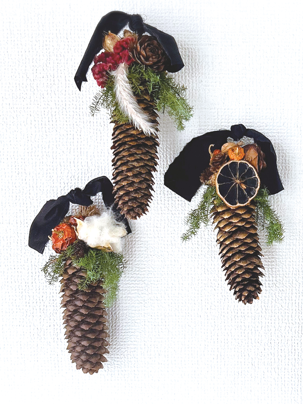 長い松ぼっくりに木の実やドライフラワーをあしらった、「松ぼっくりのオーナメント」