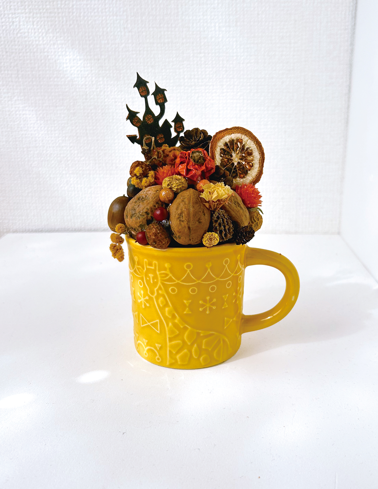 クルミの殻や木の実、ドライフラワーなどを賑やかにあしらう「マグカップのアレンジメント」(1,500円/1個) マグカップの色は3色から選べます。数に限りがあります。ご予約ください。