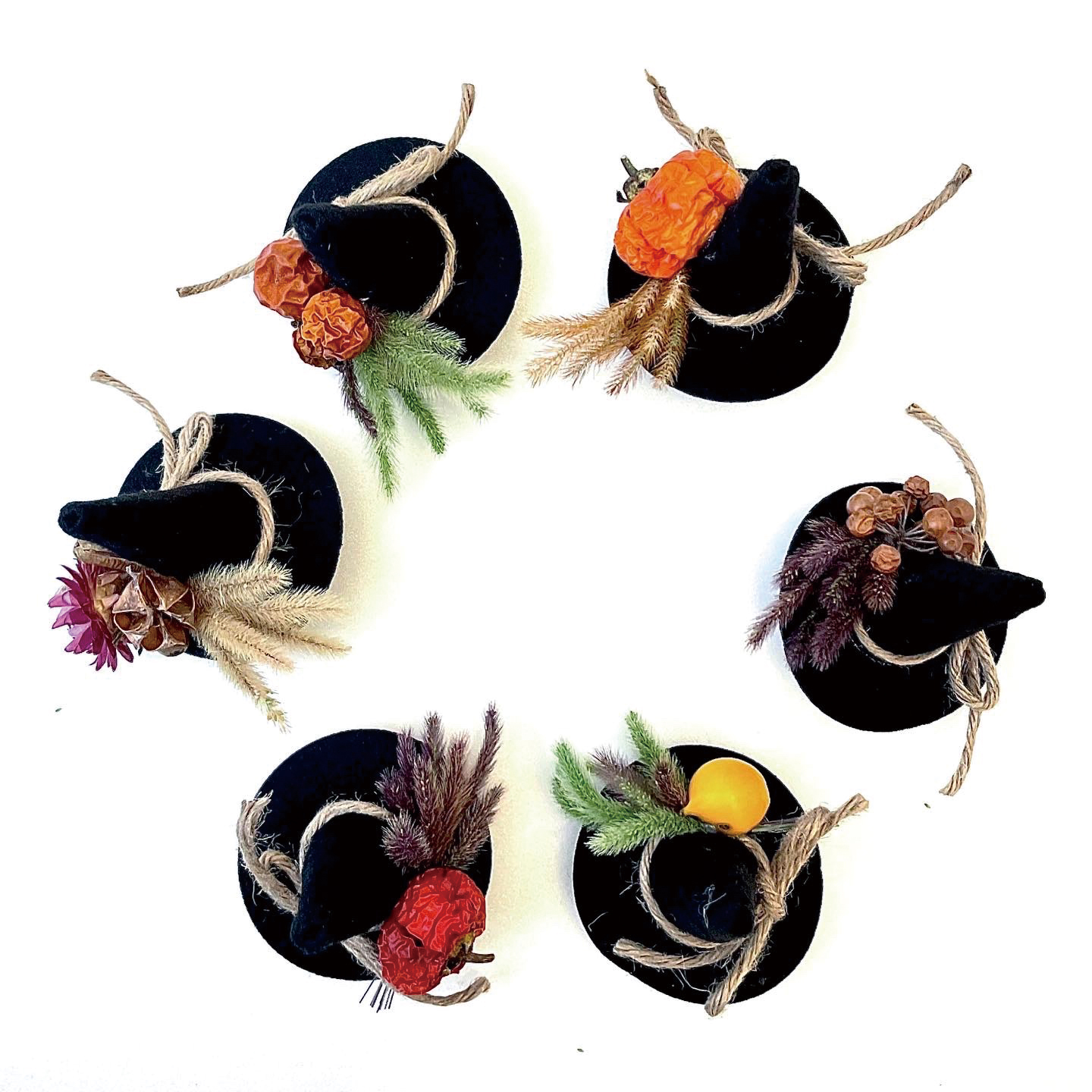 小さな魔女のぼうしに、ドライフラワーなどをつけて作る、「魔女のぼうしのバレッタ」