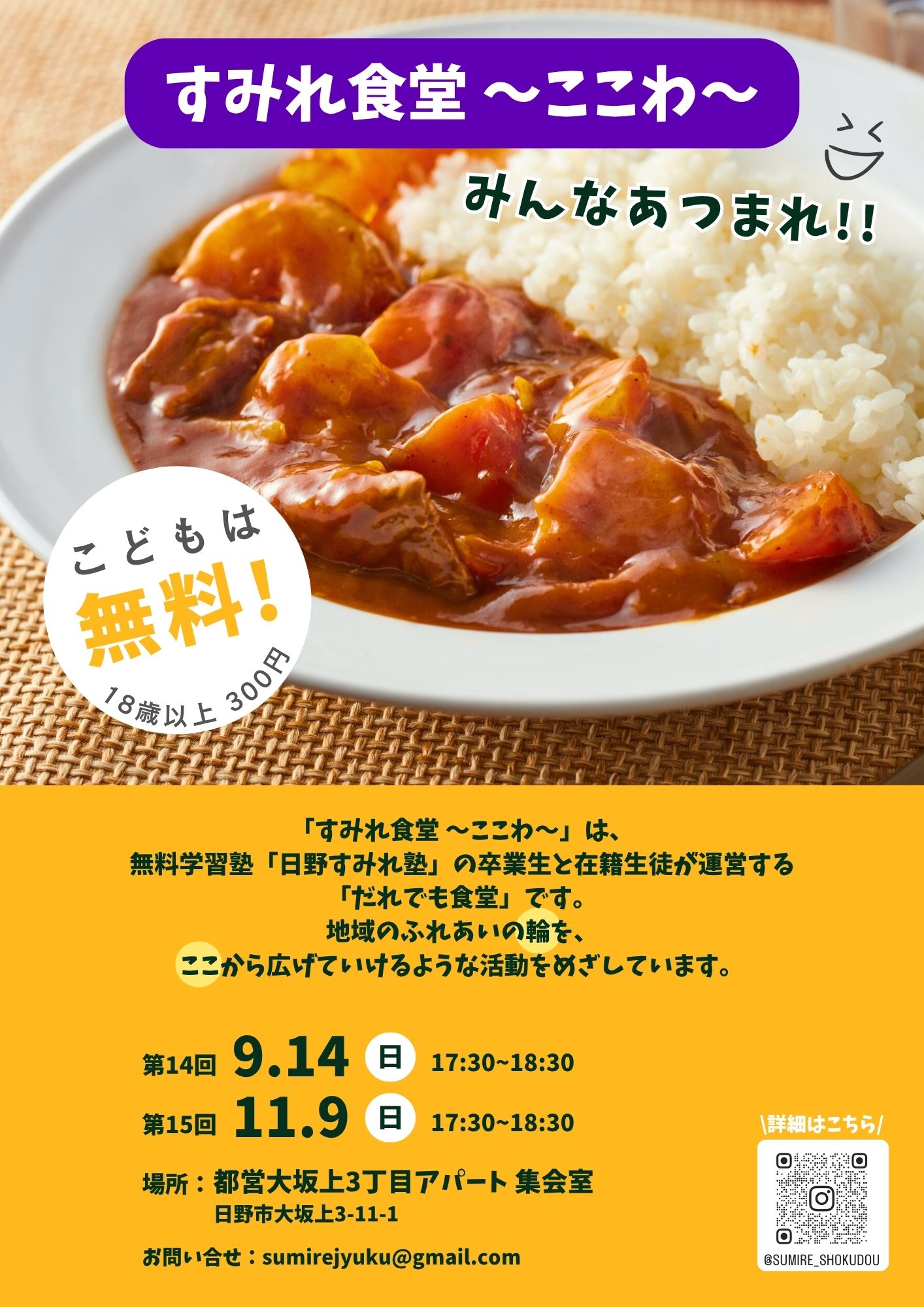「すみれ食堂 ~ここわ~」は、無料学習塾「日野すみれ塾」の卒業生と在籍生徒が主に運営する、だれでも食堂です。