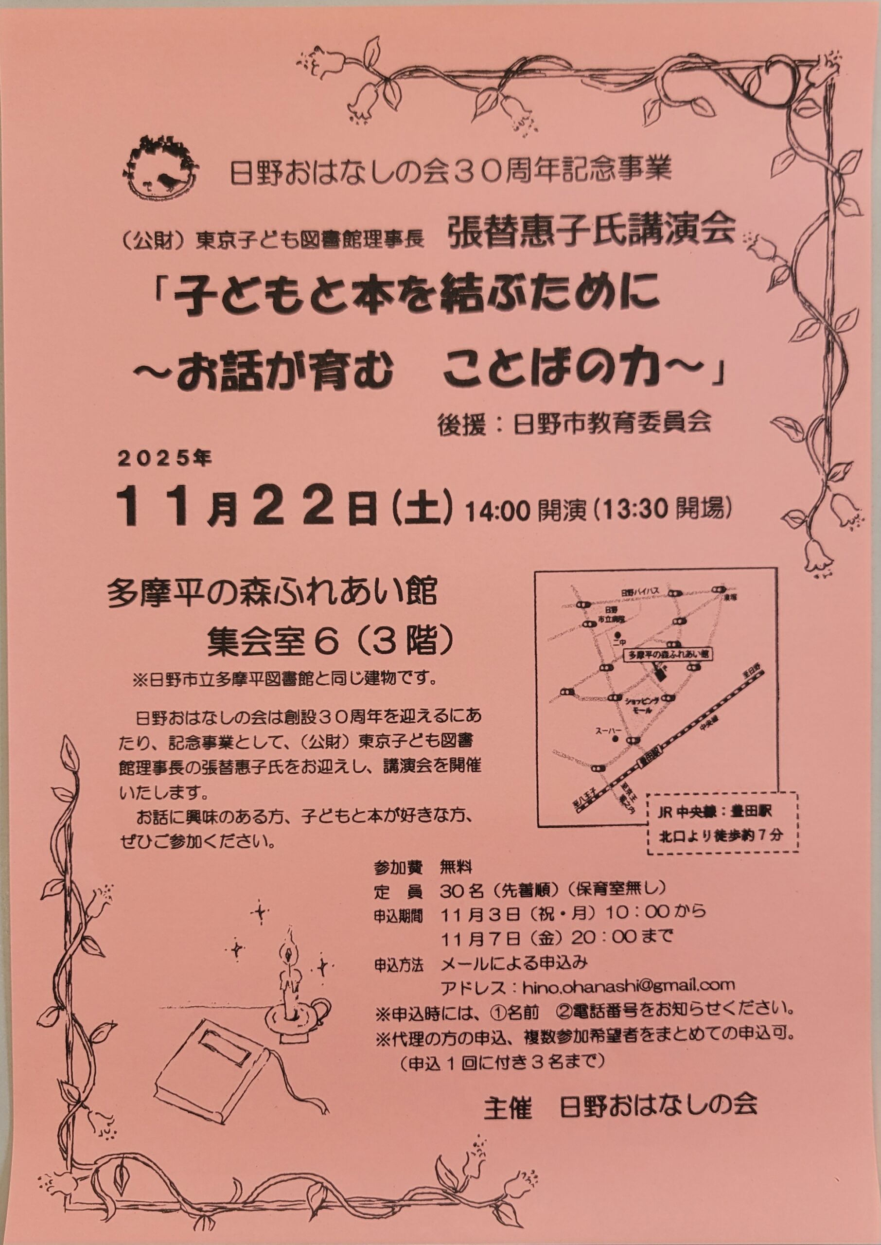 日野おはなしの会が創設30周年を迎えるにあたり記念事業としての講演会です。