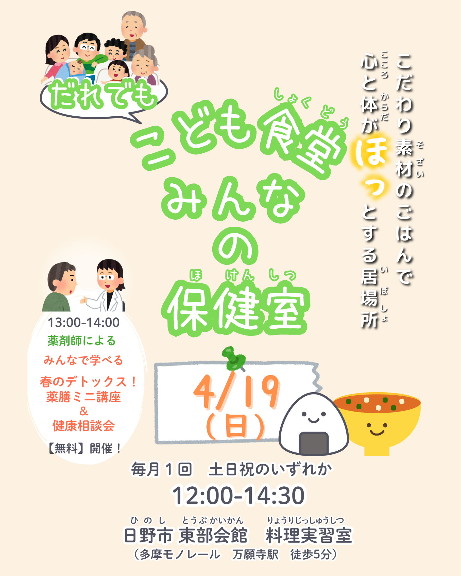 参加費 入場無料 食事代は子ども無料、大人500円 健康相談会は無料